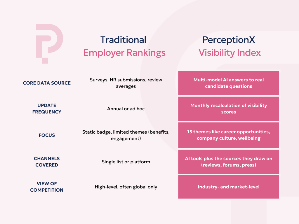 The table below shows how the PerceptionX Visibility Index differs from classic employer rankings and awards.